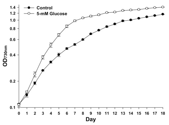 As shown in Figure 1, Synechocystis 7338 cultured with 5-mM glucose showed a higher growth than the control. Biomass production (dry weight, mg/L) was significantly higher on day 9 (99.5% increase) and 18 (53.8% increase) following exogenous glucose treatment than the control (data not shown).