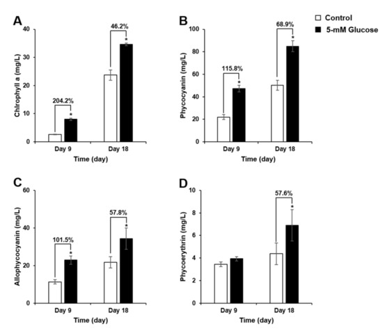 PC and APC contents were significantly enhanced on days 9 and 18, whereas PE content significantly increased on day 18. As shown in Figure 2B,C, the highest rates of increase in PC (115.8%) and APC (101.5%) were observed on day 9. In addition, exogenous glucose treatment resulted in the highest PC (84.94 mg/L), APC (34.28 mg/L), and PE (6.90 mg/L) levels on day 18 (68.9, 57.8, and 57.6% increase, respectively) in Synechocystis 7338 culture (Figure 2B–D).