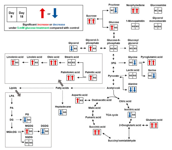 As described previously, exogenous glucose addition increased the relative levels of various Synechocystis 7338 compounds. The selected compounds from the PLS-DA-biplot are represented as relative yields in Table 4. On day 9, glucose addition significantly enhanced the relative yields of aspartic acid (4.53-fold), glutamic acid (5.07-fold), glycerol-3-phosphate (2.89-fold), linolenic acid (3.74-fold), MGDG 16:0/18:1 (22.70-fold), MGDG 16:0/20:2 (2.67-fold), MGDG 18:1/18:2 (2.51-fold), neophytadiene (4.19-fold), oleic acid (9.23-fold), PG 16:0/16:0 (2.54-fold), PG 16:0/17:2 (3.65-fold), pyroglutamic acid (2.39-fold), and sucrose (3.80-fold). Fructose and glucosamine could not be compared because they were not identified in the control samples. Relative yields of MGDG 16:0/18:1 (3.40-fold), neophytadiene (1.33-fold), and sucrose (1.10-fold) were significantly increased in the 5-mM glucose treatment on day 18 (Table 4).