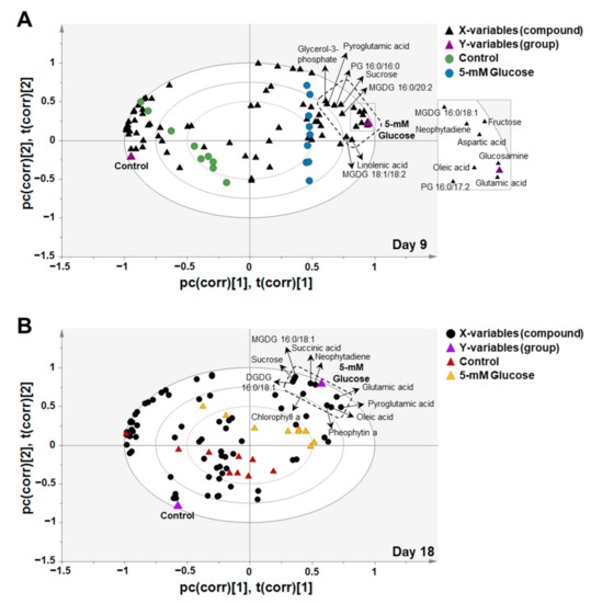 As shown in Figure 4, the PLS-DA-biplots indicate correlation between X-variables (compound) and Y-variables (group) of days 9 and 18 samples. The compounds that have high explained variances were positioned to the outer ellipses, and the three ellipse lines provide explained variances of 50%, 75%, or 100% [37,38]. Compounds positioned closer to the outer ellipse on the PLS-DA-biplot are considered to make a more significant contribution to group separation. In addition, the closely located compounds and groups in Figure 4 represented a high correlation between them, whereas the more separated compounds and groups represented a low correlation. In this study, the PLS-DA-biplot showed that aspartic acid, fructose, glucosamine, glutamic acid, glycerol-3-phosphate, linolenic acid, MGDG 16:0/18:1, MGDG 16:0/20:2, MGDG 18:1/18:2, neophytadiene, oleic acid, PG 16:0/16:0, PG 16:0/17:2, pyroglutamic acid, and sucrose were positioned closer to the 5-mM glucose group on day 9 (Figure 4A). Chlorophyll a, DGDG 16:0/18:1, glutamic acid, MGDG 16:0/18:1, neophytadiene, oleic acid, pheophytin a, pyroglutamic acid, succinic acid, and sucrose were positioned closer to the 5-mM glucose group on day 18 (Figure 4B). These compounds noticeably discriminated between the 5-mM glucose and control groups on days 9 and 18.