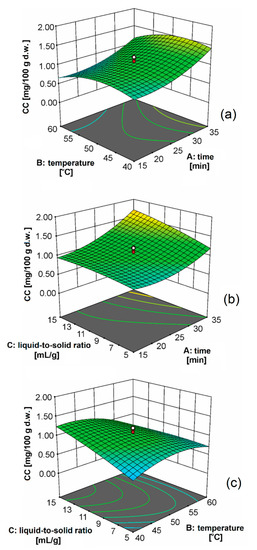 | A: Time [min] | B: Temperature [°C] | C: Solvomodul [mL/g] | CC [mg/100 g d.w.] | ||