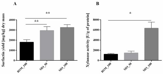 Surfactin yield (A) and general xylanase activity (B) obtained during 24 h solid-state fermentation (SSF) using B. subtilis 87Y. RSM—rapeseed meal, MO—milled oats followed by a number specifies the level of RSM replacement by MO. Statistical significance in all cases is presented as follows: * p < 0.05; ** p < 0.01.