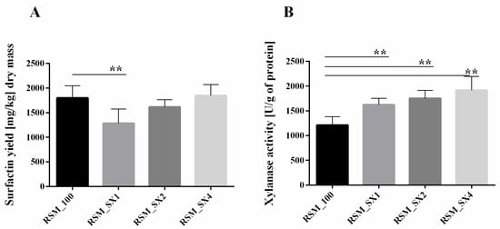 Surfactin yield (A) and general xylanase activity (B) obtained by B. subtilis 87Y during 24 h SSF on RSM with sucrose and xylan as carbon sources. SX1, 2, 4—sucrose addition in 60 g/L, xylan addition in 10, 20, or 40 g/L. Statistical significance in all cases is presented as follows: ** p < 0.01.