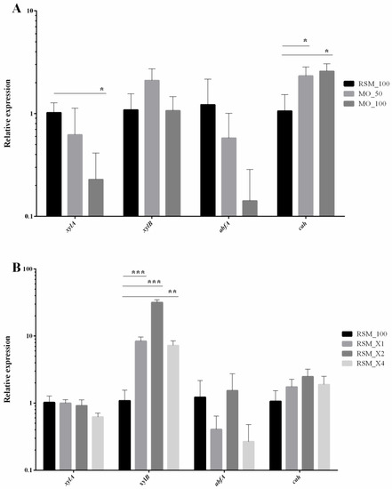While in reference conditions (RSM_100) expression of genes encoding specific xylanolytic enzymes changed with minor differences, mixing RSM with MO significantly diversified pattern of activated genes (Figure 4A). Depending on quantity of added MO, we observed a significant rise of xylB and cah genes. Acetyl xylan esterase (cah) removes O–acetyl groups from β–D–xylopiranosyl residues of acetyl xylan [35]. Synergistic action of depolymerizing and side-group-cleaving enzymes was earlier demonstrated [35]. Xylanases have limited access to xylan backbone in the absence of esterases due to high degree of acetylation. Thus, acetyl esterase acts prior to the action of xylanases [35]. In turn, expression of abfA gene coding α–arabinofuranosidase that cuts off arabinose from arabinoxylans, decreases with higher amount of MO added to base (Figure 4A). Activation level of abfA is surprising, since Avena sativa is known for quite high content of arabinoxylans [36]. In contrast to that, addition of pure xylan to RSM causes increase of xylB gene coding β–xylosidase (Figure 4B). As mentioned earlier, it was shown that addition of xylan led to activation of β–xylosidases rather than endo–β–xylanases [32], which we also observed during the experiment (Figure 4B).