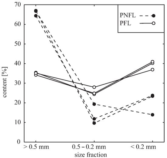 Contribution of various size fractions [w/w] in PFL- and PNFL-MO samples.