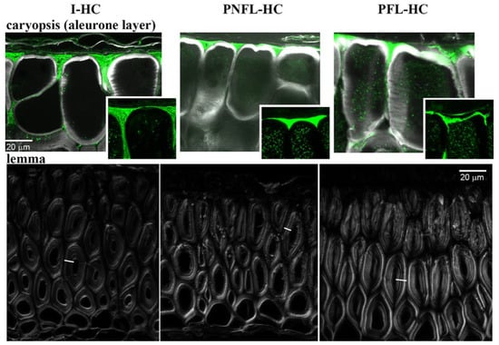 Microscopic analyses were performed on MO (PFL, PNFL) and HC (PFL, PNFL, I). Three types of samples were observed in the confocal microscopy: transverse sections through caryopsis and transverse sections through lemma, made with a razor blade; and whole mount fragments of MO. The samples were first placed in a blocking buffer containing 3% bovine serum albumin in PBS for 1 h. Next, the sections were incubated overnight with the primary antibody LM11 (PlantProbes) at 4 °C [21], rinsed in PBS (three times for 10 min), and incubated for 1 h with the secondary antibody conjugated with fluorochrome (Alexa Fluor 488), in darkness at room temperature. Following the incubation, the samples were rinsed in PBS (three times for 10 min), counterstained with 0.01% Calcofluor White (Fluorescent Brightener 28, Sigma-Aldrich) in PBS solution, and again rinsed with PBS (five times for 5 min) [22]. Such prepared samples were mounted on glass slides in Floromount (Sigma-Aldrich). The fluorescence of the Calcofluor White (excitation 365 nm, emission 435 nm) and of the secondary antibody (excitation 490 nm, emission 525 nm) were detected using Olympus FV-1000 confocal system equipped with Olympus IX 81 inverted microscope, a 405 nm diode laser, and a multi-line (458 nm, 488 nm, 515 nm) argon ion laser (Showa Optronics Co., Ltd, Tokyo, Japan).
