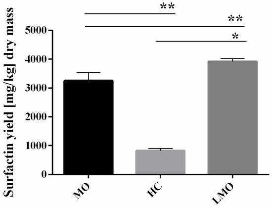 Surfactin yield obtained with B. subtilis 87Y during 24h of SSF on milled oats (MO), hulled caryopses (HC) and large fragments separated from milled oats (LMO). Statistical significance in all cases is presented as follows: * p < 0.05; ** p < 0.01.