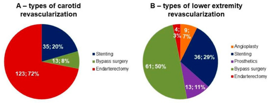 Types of surgical operations. Data are presented as absolute number of patients (%). (A) Types of carotid revascularization. (B) Types of lower extremity revascularization.
