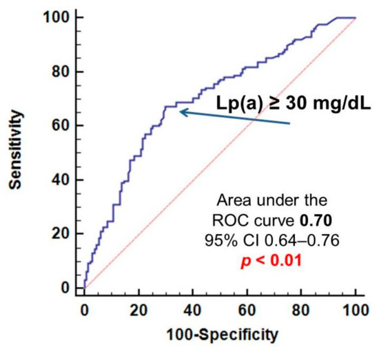 According to ROC-analysis, the concentration of Lp(a) more than 30 mg/dL was associated with CVE after revascularization of peripheral arteries with a sensitivity of 63% and a specificity of 71% (Figure 2). Lp(a) ≥ 30 mg/dL (hyperlipoproteinemia(a)) was not associated with past myocardial infarction and ischemic stroke: OR 1.0, 95% CI 0.6–1.7, p = 1.0 and OR 1.0, 95% CI 0.5–1.8, p = 0.9, respectively.