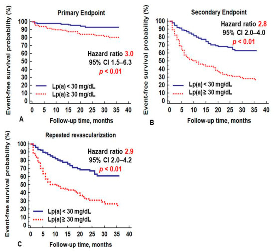 In patients with hyperlipoproteinemia(a), more CVE were recorded: 21 primary endpoints and 83 secondary endpoints, while in patients with a concentration of Lp(a) < 30 mg/dL, 8 primary and 45 secondary endpoints were diagnosed (p < 0.01 for both). In Kaplan–Meier analysis, the survival curves diverged significantly depending on the Lp(a) level (Figure 3). Hyperlipoproteinemia(a) was associated with an increased risk of primary and secondary endpoints after peripheral revascularization: hazard ratio (HR) 3.0; 95% CI 1.5–6.3; p < 0.01 and HR 2.8; 95% CI 2.0–4.0; p < 0.01, respectively. During 3 years follow-up repeated revascularization at target vessel due to restenosis was registered in 111 patients. Hyperlipoproteinemia(a) was associated with an increased risk of repeated revascularization: HR 2.9; 95% CI 2.0–4.2, p < 0.01.