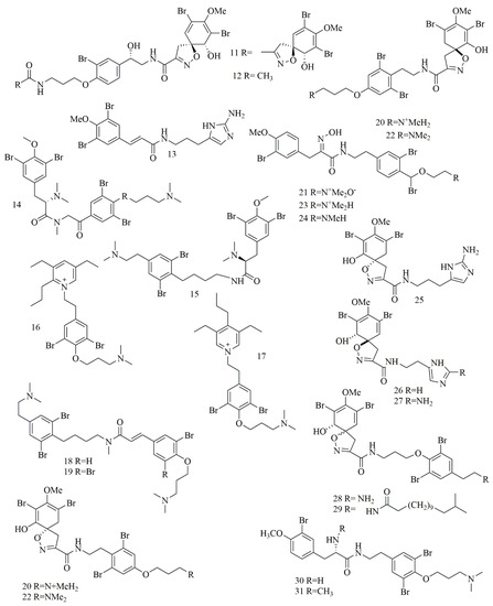 Qun Göthel et al. reported three bromotyrosine alkaloids identified as 14-debromo-11-deoxyfistularin-3 (11), aplysinin A (12), and aplysinin B (13) from the sponge Aplysina lacunosa collected from Stirrup Cay in the Bahamas. Compounds 11–12 revealed a unique, five-membered oxazole ring with a spiro atom linked with the bromocyclohexa-diene ring [26]. Investigation of different sponge samples belonging to genus Hexadella sp., Jaspis sp. and Bubaris sp., collected from Indonesia by Tarazona, and co-workers led to the isolation and identification of new bromotyrosine alkaloids 14–15. Aplyzanzine B (14) was isolated from Jaspis sp., and Bubaris sp., whereas Anomoian B (15) was isolated from Hexadella sp. have shown potent cytotoxic activity against three human tumor cell lines A549, HT-29, and MDA-MB-231 (6.1, 1.6, and 7.8 μM, respectively) [27].