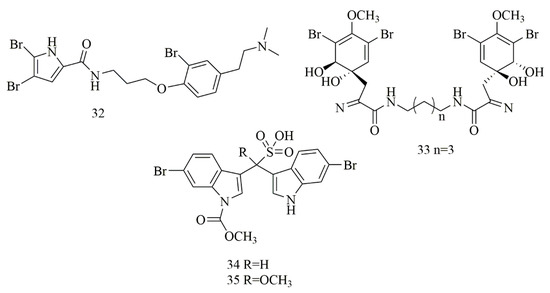 Tilvi et al. reported three new pyrrole-2-aminoimidazole alkaloids from the Agelas dendromorpha collected from New Caledonia. Cytotoxic investigation of the isolated compounds revealed that only one compound identified as Agelastatin E (32) that showed 100% activity at 3 and 30 µM against KB cell lines [32]. In Shaala et al. a dibrominated alkaloid, aerothionin (33) with potent cytotoxicity against HeLa cells was identified from the sponge, Suberea sp., collected from the Red Sea in Yanbu, Saudi Arabia [33]. Two brominated indolosulfonic acid derivatives were reported from the hydroalcoholic extract of the Psammoclemma sp., collected from New Caledonia. The compounds were identified as echinosulfonic acid D (34) and echinosulfonic acid B (35) based on extensive LC/MS/MS analysis besides conventional 1 and 2 D NMR analysis. Both compounds showed potent cytotoxicity against KB cells with equal IC50 of 2 µg/mL [34]. Figure 4 illustrates the chemical structures of compounds 32–35; Table 4 summarizes the cytotoxic evaluation of compounds 32–35.