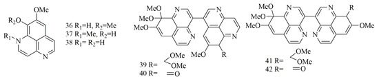 Bioassay-guided fractionation of the Indonesian sponge Aaptos suberitoides resulted in the isolation of three benzonaphthryidine derivatives identified as aaptamine (36), isoaaptamine (37), and demethylaaptamine (38). Biological evaluation of compounds 36–38 revealed potent cytotoxicity against HeLa cell lines with IC50 values of 15, 3.1, and 1.4 µg/mL, respectively. Moreover, the activity had been attributed to proteasome inhibitory action [35]. Investigation of a different sample from the same sponge A. suberitoides, collected from Xisha islands in the South China Sea (NaiHai), has led to the isolation of additional aaptamine derivatives with dimerization in the benzonathyridine moiety, the compounds were identified as suberitine A (39), suberitine B (40), suberitine C (41) and suberitine D (42). Cytotoxic evaluation of 39–42 against P388, HeLa, and K562 cell lines revealed selective, potent activity of compounds 40 and 42 with IC50 values of 1.8 and 3.5 μM, respectively, against P388 cell line with the absence of activity on other lines. Interestingly, compounds 39 and 41 did not show significant effects against any of the cell lines, revealing the possible need of exocyclic double bond in one of the monomer units either as ketone as in 42 or exocyclic terminal methylene as in 40 [36]. Figure 5 illustrates the chemical structures of compounds 36–42; Table 5 summarizes the cytotoxic evaluation of compounds 36–42.