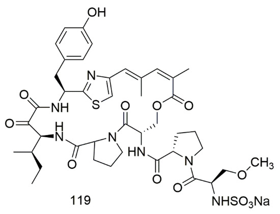 Scleritodermin A (119), a potent sulfonated thiazol hexapeptide was isolated from the marine sponge Scleritoderma nodosum collected from the northwest side of Olango Island, Cebu, Philippines. The purified compound demonstrated low µM cytotoxicity to HCT116, A2780, and SKBR3 cell lines with IC50 of 1.9, 0.940, and 0.670 µM, respectively [67]. Figure 9 illustrates the chemical structures of compound 119; Table 9 summarizes the cytotoxic evaluation of compound 119.
