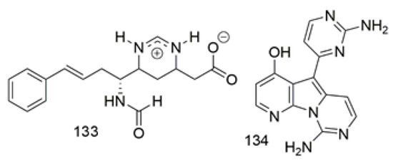 Lanesoic acid (133), was isolated as zwitterionic alkaloid from Theonella swinhoei a sponge of Theonella family collected from Lanes in Indo-Pacific, Indonesia. Compound 133 displayed an unusual 1, 4, 5, 6-tetrahydropyrimidine cation rarely exhibits in natural sources. Compound 133 was evaluated for cytotoxicity against a panel of cell lines, such as PSN1, HT-29, breast MD-MB-231, and A549, that revealed selective cytotoxicity against PSN1cells with an IC50 value of 28.2 μM and was inactive against NSCLC lung tumor, MD-MB-23, and HT-29 cells [75]. The alkaloid variolin B (134), heterocyclic constitute from the Antractic sponge Kirkpatrickia variolosa had been evaluated for cytotoxicity against a wide range of cancer cell lines, where it showed potent activity against most of the tested cell lines with the activity against androgen-sensitive prostate adenocarcinoma cell line with GI50 0.05 µM [76]. Figure 11 illustrates the chemical structures of 133–134; Table 11 summarizes the cytotoxic evaluation of 133–134.