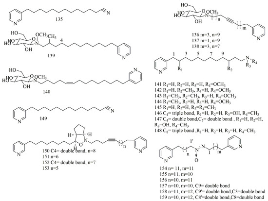 The sample of Haliclona sp., collected from Indonesia, contained pyridine alkaloid cyano -3-dodecyl pyridine (135). Compound 135 showed moderate cytotoxity against A549, MCF-7, and Hela cell lines with IC50 values of 41.8, 48.4, and 33.2 μM, respectively [77]. Four pyridine glycosides had been isolated from Amphimedon sp., collected from Hachijo Island, Japan. The glycosidal alkaloids were identified as amphimedoside A (136) as a β-glucopyranose, amphimedoside C (137), a positional isomer of amphimedoside B (138) in the acetylenic bond with same molecular formula C26H42N2O6, amphimedoside D (139) and amphimedoside E (140). The results proved the cytotoxicity of 136–140 against P388 with IC50 values 90.0, 10.4, 23.0, 0.9, and 4.5 µM, respectively. These β-glucopyranosyl 3-alkylpyridine alkaloids exhibited comparable cytotoxic activities with aglycones [78]. Interestingly, from two different sponges Xestospongia sp. and Amphimedon sp., collected from Hachijo island, Japan l seven related 3-alkylpyridine alkaloids were reported: Hachijodine A (141) hachijodine B(142), hachijodine C(143), and hachijodine D(144) from Xestospongia sp., and hachijodine E (145), hachijodine F (146), and hachijodine G (147) from Amphimedon sp. [79]. N-methylniphatyne A (148), a 3-alkylpyridine alkaloid, was isolated from marine sponge of Xestospongia sp., collected off Java Island, Indonesia. Compound 148 was identified as N-methyl derivative of niphatyne A (149), which was reported from Fijian sponge of Niphates sp. Compound 148 revealed potent cytotoxicity against PANC-1 cells with IC50 value of 16 µM, whereas 149 showed cytotoxic effect of 2 µM on P388 cells [80]. Pyrinodemin A-D (150–153) were isolated from Okinawan sponge Amphimedon sp., collected off Nakijin, Okinawa. Compounds 151–153 showed strong cytotoxicity on L1210 with IC50 value (0.12, 0.10 and 0.14 µM, respectively) and KB with IC50 value (0.89, 0.89, 0.91 µM, respectively) [81]. Pyrinadines B-G (154–159), bis-3-alkylpyridine alkaloids with an azoxy moiety, were reported from the Okinawan sponge Cribrochalina sp., collected from Unten Port, Okinawa. Compounds 154–159 showed potent cytotoxic effects on L1210 cell line with IC50 values (23.0, 18.1, 17.3, 16.0, 11.9 and 11.9 µM, respectively). However, they did not this effect on KB cell line (IC50 > 20 µg/mL) [82]. Figure 12 illustrates the chemical structures of 135–159; Table 12 summarizes the cytotoxic evaluation of 135–159.