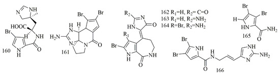 Stylissa carteri collected from the Red Sea, Hurghada, Egypt, was the source of (−) clathramide C (160) (+)-dibromophakelline (161), (Z)-spongiacidin D (162), (Z)-hymenialdisine (163), (Z)-3-bromohymenialdisine (164) and 3,4-dibromo-1H-pyrrole-2-carbamide (165). Compounds 160–164 were evaluated for their cytotoxic activity against L5178Y and HCT116 cell lines. Regarding L5178Y cell line, 161 and 164 displayed cytotoxic effects with inhibition of growth 57.0% and 60.5%, respectively (10 μg/mL), while the cytotoxicity of 160, 162, 163 and 165 were not potent (growth inhibition of 25.3%, 36.7%, 37.0% and 38.4%, respectively) [83]. Oroidin (166), a pyrrole alkaloid from Agelas oroides., showed the cytotoxic activity with the GI50 of 42 µM on MCF-7, 24 µM on A2780 cells and more than 50 µM on HT29, SW480, H460, A431, Du145, BE2-C, SJ-G2, MIA, SMA, and U87 cell lines [84]. Figure 13 illustrates the chemical structures of 160–166; Table 13 summarizes the cytotoxic evaluation of 160–166.
