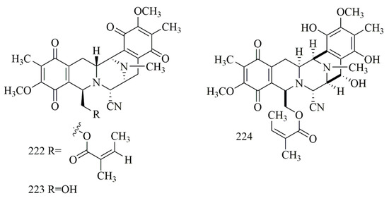 Based on the study by Sirimangkalakitti et al., bistetrahydroisoquinoline alkaloid, including renieramycin M (222), are mainly identified from sponges of the genera Reniera, Haliclona, Xestospongia, Neopetrosia, and Cribrochalina. Other renieramycin-type alkaloids, such as jorunnamycin A (223), were purified from the sponge-eating nudibranch Jorunnaf unebris, 222–223 were also reported from the Thai blue sponge Xestospongia sp., collected off Sichang island, the Gulf of Thailand. Compounds 222–223 revealed outstanding cytotoxic activity versus H292 cell line with IC50 (23 ± 4 and 220 ± 20 nM, respectively) and H460 cell line with IC50 8.3 ± 0.6 and 160 ± 10 nM, respectively [94]. Renieramycin J (224), which has been reported from Neopetrosia sp., collected off Kuchinoerabu-jima island also showed outstanding cytotoxicity on 3Y1, HeLa, and P388 cells with IC50 values 5.3, 12.3, and 0.53 nM, respectively [95]. Figure 16 illustrates the chemical structures of 222–224; Table 16 summarizes the cytotoxic evaluation of 222–224.