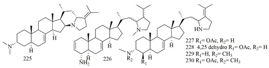 In this review, a comprehensive survey of about 240 alkaloids isolated from marine sponges from 1987 to 2020 had been performed, to shed light on those alkaloids demonstrating potent in vitro cytotoxicity, different resources, and databases, including Scifinder (database for the chemical literature) CAS (Chemical Abstract Service) search, web of science, Marin Lit (marine natural products research) database, were used. Moreover, review articles reviewing secondary metabolites from sponges were included [1,18,19,20,21,22]. Throughout this review, the alkaloids were classified into 20 different chemical classes (acridine, β-carboline, bromotyrosine, brominated, dimeric aaptamine, guanidine, imidazole, indole, peptide, piperidine, pyrimidine, pyridine, pyrrole, pyrroloiminoquinone, quinoline and quinolizidine, tetrahydroisoqouinoline, steroidal, terpenoidal, manzamine, and sesquiterpene quinones/hydroquinones alkaloid), and representative examples of each class have been reviewed with about 240 molecules described. It is worth noting that an individual alkaloid may fall in more than one chemical class, and placing certain alkaloid in a specific class was based on the authors’ classification in the original articles.