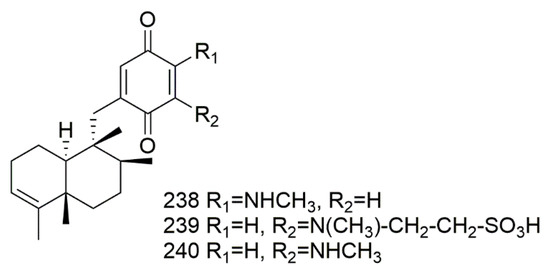This class of compounds demonstrates potent biological activities that can be considered as lead compounds for the development of potent antibiotics, antifungal, antiviral, anti-inflammatory, antimalarial, immune-modulating, or neuro-suppressive [5,6,7,8,9,10,11,12]. They also demonstrated promising cytotoxic activity versus diverse types of cancer cells [13,14]. Sponges (porifera), phylogenetically the oldest metazoan, have been recognized as a precious origin of unique secondary metabolites. About 5000 sponge species had been identified and classified with major groups belonging to Demospongiae [15]. They demonstrated wide distribution from intertidal coastal regions to great depths up to 8000 m depth [16]. The outstanding secondary metabolites produced by sponges are assumed to be the result of a combination of various factors, including the sessile nature of the organism, the porous nature of the body, and the environmental and ecological factors surrounding the organism [17]. As a consequence, it is obvious that these indefensible immobile organisms were provided by potent allelopathic factors that lead to the biosynthesis of many new drugs.