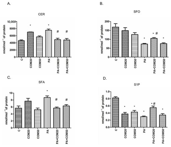 In primary rat hepatocytes there was a significant elevation in CER concentration among groups incubated with COM20 alone (+51.79%, p < 0.05, Figure 1A) and PA alone (+62.81%, p < 0.05, Figure 1A) compared to the control group. In contrary, the accumulation of CER was considerably decreased in hepatocytes incubated with PA + COM20 as well as PA + COM50 (−34.85%, p < 0.05 and −36.19%, p < 0.05, Figure 1A, respectively) compared with the PA group. A significant decrease in the SFO concentration was observed after incubation with PA, PA + COM20, and PA + COM50 groups (−56.22%, p < 0.05; −37.44%, p < 0.05; −54.98%, p < 0.05; Figure 1B, respectively) in comparison with the control group. Furthermore, the concentration of SFO notably increased after incubation with PA + COM20 compared to the PA group (+42.9%, p < 0.05, Figure 1B). A significant drop in SFA concentration was observed in groups treated with PA + COM20 as well as PA + COM50 (−34.57%, p < 0.05 and −33.56%, p < 0.05, Figure 1C, respectively) compared to the group incubated with PA. A significant decrease in S1P concentration was noted in either COM20 or COM50 groups incubated alone in comparison with the control group (COM20: −54.55%, p < 0.05; COM50: −48.18%, p < 0.05; PA: −64.04%, p < 0.05 Figure 1D) as well as in the groups incubated simultaneously with PA (PA + COM20: −33.33%, p < 0.05; PA + COM50: −58.38%, p < 0.05, Figure 1D). Additionally, the incubation with PA + COM20 resulted in substantial elevation in the S1P concentration compared to the PA group (+85.39%, p < 0.05, Figure 1D).