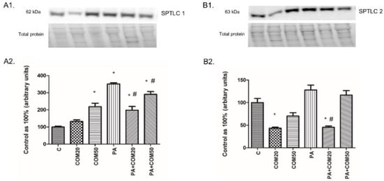 Representative Western blot membranes of evaluated proteins, i.e., SPTLC1—serine palmitoyl transferase 1 (A1), SPTLC2—serine palmitoyl transferase 2 (B1), and the corresponding images of total protein staining after membrane transfer used for normalization. The expression of enzymes involved in ceramide de novo synthesis pathway, i.e., SPTLC1 (A2) and SPTLC2 (B2) in primary rat hepatocytes. The cells were incubated with presence or absence of PA (0.5 mM) or/and COM (20 or 50 μM), as it was described in Materials and Methods section. The protein expression was evaluated by the Western blot technique. The data are shown as the mean ± SD and are based on six independent determinations (n = 6); * p < 0.05 significant difference vs. control group; # p < 0.05 significant difference vs. palmitate group; C, control; COM20 or COM50, coumestrol 20 or 50 μM; PA, palmitic acid; PA + COM20 or PA + COM50, palmitic acid + coumestrol 20 or 50 μM.