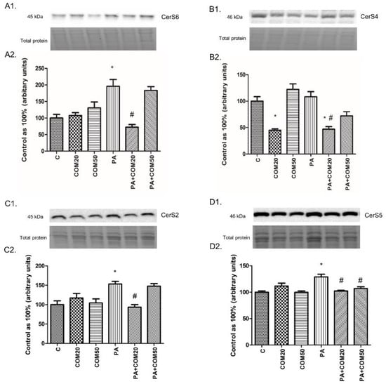 We observed notable changes in the expression of CerS6, CerS4, CerS2, and CerS5 after incubation with PA + COM20 compared to the PA group (−63.03%, p < 0.05 Figure 4A2; −56.74%, p < 0.05, Figure 4B2; −39.04%, p < 0.05, Figure 4C2; −20.67%, p < 0.05, Figure 4D2, respectively). The expression of CerS4 decreased significantly in groups incubated with COM20 and PA + COM20 in comparison with the control group (−55.1%, p < 0.05; −53.1%, p < 0.05, Figure 4B2, respectively). Furthermore, the expression of CerS5 also decreased after incubation with PA + COM50 (−17.03%, p < 0.05, Figure 4D2).