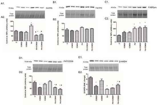 Representative Western blot membranes of evaluated proteins, i.e., FATP5 (A1), FATP2 (B1), FABPpm (C1), FAT/CD36 (D1), β-HADH (E1), and the corresponding images of total protein staining after membrane transfer used for normalization. The expression of proteins involved in fatty acid uptake, i.e., FATP5 (A2), FATP2 (B2), FABPpm (C2), FAT/CD36 (D2), and β-oxidation, namely, β-HADH (E2) in primary rat hepatocytes. The cells were incubated with presence or absence of PA (0.5 mM) or/and COM (20 or 50 μM), as it was described in Materials and Methods section. The protein expression was evaluated by the Western blot technique. The data are shown as the mean ± SD and are based on six independent determinations (n = 6); * p < 0.05 significant difference vs. control group; # p < 0.05 significant difference vs. palmitate group; C, control; COM20 or COM50, coumestrol 20 or 50 μM; PA, palmitic acid; PA + COM20 or PA + COM50, palmitic acid + coumestrol 20 or 50 μM.