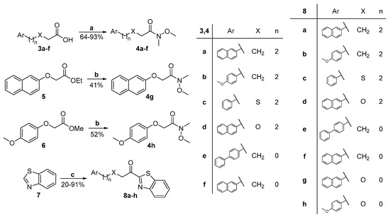 Benzothiazolyl ketones were synthesized in two steps, most of them starting from the corresponding carboxylic acids, as shown in Figure 3. The first step involves the formation of the Weinreb amides 4a–f by coupling of carboxylic acids 3a–f with N,O-dimethylhydroxylamine hydrochloride using N-(3-dimethylaminopropyl)-N’-ethyl carbodiimide hydrochloride (WSCI·HCl) as the coupling agent [17,23]. Weinreb amides 4g,h were prepared from esters 5 and 6 using N,O-dimethylhydroxylamine hydrochloride, in the presence of isopropylmagnesium chloride (i-PrMgCl) [24]. A nucleophilic attack of benzothiazolyl lithium to Weinerb amides 4a–h afforded the desired α-heterocyclic ketones 8a–h (Figure 3).