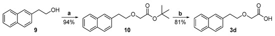 Carboxylic acid 3d, required for the synthesis of 8d, was prepared in two steps via etherification of alcohol 9 with tert-butyl 2-bromoacetate, followed by deprotection using trifluoroacetic acid (TFA) (Figure 4).