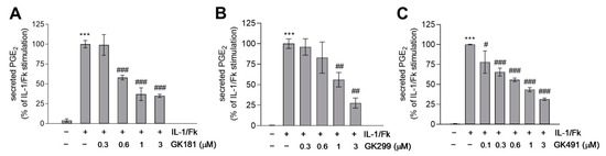 Effect of compounds (A) GK181, (B) GK299, and (C) GK491 on IL-1/Fk-stimulated PGE2 formation in mesangial cells. Cells were pretreated for 20 min with the indicated concentrations of GK compounds and then stimulated for 24 h in the absence (−) or presence (+) of 1 nM interleukin 1β(IL-1) plus 5 µM forskolin (Fk). Supernatants were taken for PGE2 quantification using an enzyme-linked immunoassay as described in the Methods section. Data are presented as % of maximal IL-1/Fk stimulation and are means S.D. (n = 3). *** p < 0.001 considered statistically significant when compared to the unstimulated samples; # p < 0.05, ## p < 0.01, ### p < 0.001 compared to the IL-1/Fk-stimulated samples.