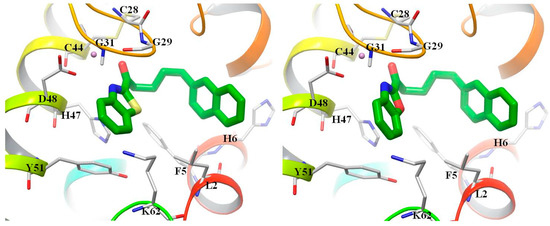 As shown in Figure 9 for both GK181 and GK491, the naphthyl group is accommodated at the lipophilic pocket of the site and is involved in a T-shape interaction with His6. The carbonyl group points towards Ca2+ ion and is close enough to Gly29 to form a hydrogen bond. The extended heterocyclic aromatic system is involved in π–π interactions with the catalytic His47. These two models reproduce the key interactions, as known by co-crystallized ligands [31], and therefore may suggest the mode of interactions between either GK181 or GK491 and secreted sPLA2.
