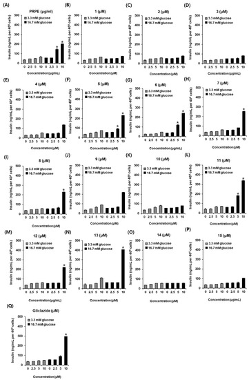 Effect of PRPE and compounds 1–15 on glucose-stimulated insulin secretion (GSIS, ng/mL per 400,000 cells) in INS-1 cells. Effect of (A) PRPE, (B–P) compounds 1–15, and (Q) gliclazide (positive control) compared with the control (0 μg/mL or 0 μM) on GSIS (ng/mL per 400,000 cells) in INS-1 cells for 1 h by insulin secretion assay (n = 3 independent experiments, * p > 0.05, Kruskal–Wallis nonparametric test). Data represent the mean ± SEM.