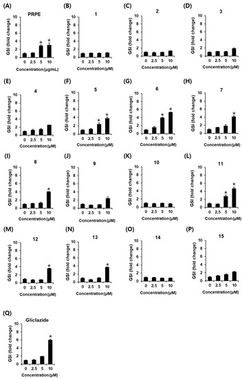 Effect of PRPE and compounds 1–15 on glucose-stimulated insulin secretion (GSIS) expressed as the glucose stimulation index (GSI) in INS-1 cells. Effect of (A) PRPE, (B–P) compounds 1–15, and (Q) gliclazide (positive control) compared with the control (0 μg/mL or 0 μM) on GSIS expressed as the GSI in INS-1 cells for 1 h by insulin secretion assay. GSI = insulin level in high glucose (16.7 mM)/insulin level in low glucose (3.3 mM). (n = 3 independent experiments, * p > 0.05, Kruskal–Wallis nonparametric test). Data represent the mean ± SEM.