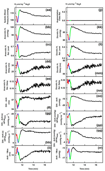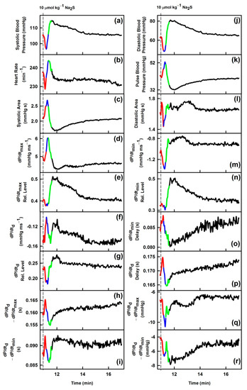Time-dependent changes of hemodynamic parameters (HPs) of anesthetized rat after i.v. bolus administration of 10 µmol kg−1 Na2S (marked by dash lines). The red line starts 3 s before Na2S administration. Colors: time period corresponding to the decrease of systolic BP (red), increase of systolic BP to the control value (blue), further increase of systolic BP to the maximum (green) and decrease of systolic BP to the control value (black). For the explanation of (a), (b) … (rr) plots see the Description of the Table 1 and Figure S1. Units in plots (gg), (hh), (pp) and (qq) are informative only.