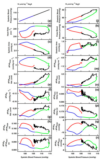 Since H2S transiently decreased systolic BP, similarly to NO-donor GSNO, we compared the H2S data from Figure 3 to the published GSNO data (Figure 3c in Reference [4]). From the comparison of the H2S and GSNO non-hysteresis/hysteresis cross-relationship “patterns” of the 34 HPs to systolic BP, it is evident that most of the “patterns” are not the same—actually, some of them are opposite. For example, in the dP/dtmax to the systolic BP (plot (d)), hysteresis was observed in the case of H2S, but non-hysteresis in the case of GSNO response. Similarly, opposite non-hysteresis/hysteresis relationships were observed for diastolic BP (j), pulse BP (k) or dP/dtd − dP/dtmax (q). However, similar non-hysteresis/hysteresis relationships for H2S and GSNO were observed for dP/dtmax-RL (e), (DiN − AnN)/dP/dtmax (hh) or AnN − 1Max (rr).
