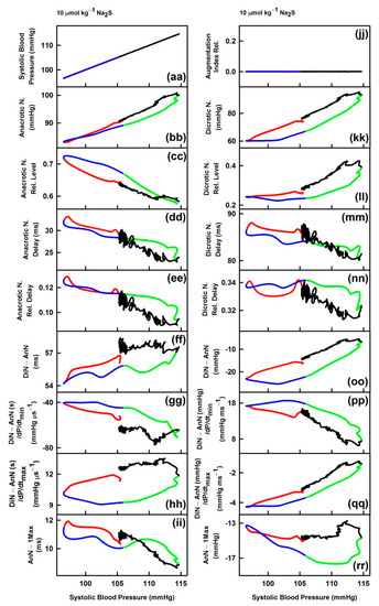 Relationships of HPs to the systolic BP after the administration of 10 µmol kg−1 Na2S. The colors and time-dependent data correspond to Figure 1. Time period corresponds to the decrease of systolic BP (red), increase of systolic BP to the control value (blue), further increase of systolic BP to maximum (green), and decrease of systolic BP to the control value (black). The hysteresis was arbitrarily defined as HP − systolic BP (in mmHg) loop > 5 mmHg of systolic BP. For the explanation of (a), (b) … (rr) plots see the Description of the Table 1 and Figure S1. Units in plots (gg), (hh), (pp) and (qq) are informative only.