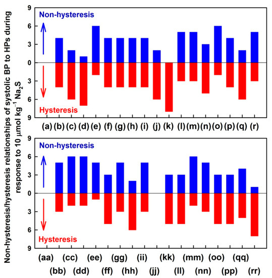 Number of rats, that represent the non-hysteresis or hysteresis “patterns” of the relationships of HPs to the systolic BP after the administrations of 10 µmol kg−1 Na2S during decrease (red line in Figure 1 and Figure 2) and increase (blue line in Figure 1 and Figure 2) of BP. Data were taken from Figure 2 and Figures S9–S15. The total number of rats in which non-hysteresis (blue) or hysteresis (red) “patterns” were evaluated is n = 8. The hysteresis was arbitrary defined as HP − systolic BP loop >5 mmHg of systolic BP. For the explanation of (a), (b) … (rr) plots see the Description of the Table 1 and Figure S1.