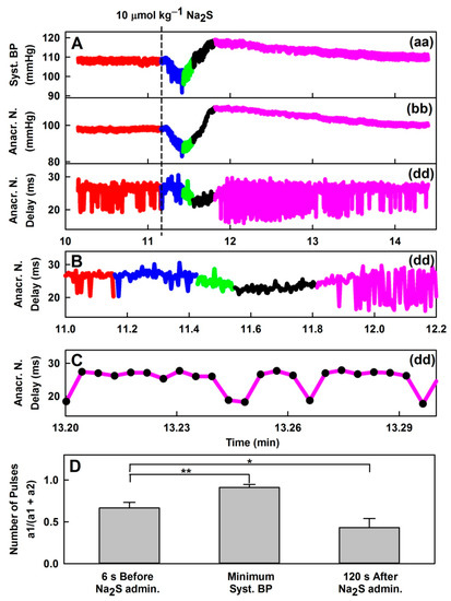 Representative non-filtered time-dependent effect of 10 µmol kg−1 Na2S on three HPs. (A) systolic BP (Syst. BP, mmHg) (aa), AnN (Anacr. N., mmHg) (bb) and AnN delay (Anacr. N. delay, ms) (dd); (the 10–15 min period is shown). (B) The fluctuation of AnN delay (dd); (11–12 min) reflects the time interval fluctuation between a1 and a2 points (Figure S1B). The higher value of AnN delay in ms indicates that diastolic BP at point a1 was lower than at point a2. (C) The fluctuation between a1 and a2 points in pulses (black circles) recorded at high resolution at 120 s after the 10 µmol kg−1 Na2S administration. Data were taken from Figure S8. (D) Comparison of the ratio of a1/(a1 + a2) pulses in 6 s long interval: Starting 6 s before the 10 µmol kg−1 Na2S administration; from 3 s before to 3 s after the minimum of systolic BP, and 120 s after the 10 µmol kg−1 Na2S administration. Data represent means ± SEM. Statistically significant differences between group means were determined by one-way repeated-measures ANOVA (p < 0.0001) with Dunnett’s post-hoc test (*p < 0.05, **p < 0.01, n = 8). For the explanation of (aa), (bb) and (dd) plots see the Description of the Table 1 and Figure S1.