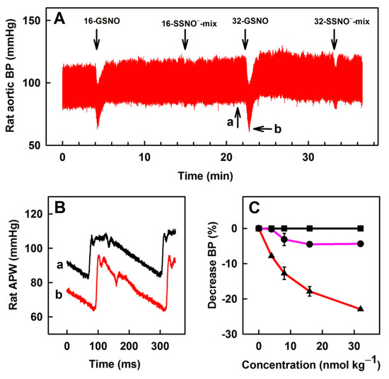 Effects of i.v. bolus administration of 16 and 32 nmol kg−1 GSNO (16- and 32-GSNO), 16 and 32 nmol kg−1 SSNO−-mix on BP in anesthetized rat (A) and the representative rat arterial pulse waveforms (B) before (a) and after (b) the administration of 32 nmol kg−1 GSNO. Comparison of the concentration-dependent effects of GSNO (red), SSNO−-mix (pink) and Na2S (black) on BP (C); n = 5 rats; number of administrations for each concentration ≥2. Data represent means ± SEM.