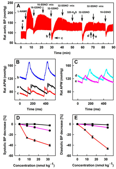 Effects of i.v. bolus administration of 16 and 32 nmol kg−1 GSNO (16- and 32-GSNO), 16 and 32 nmol kg−1 SSNO−-mix and 320 nmol kg−1 Na2S (320-H2S) on BP in anesthetized rat in the presence of 25 mg kg−1 L-NAME (A) and the representative rat arterial pulse waveforms (B,C) before the administration of L-NAME (a), before (b) and after (c) the administration of 32 nmol kg−1 GSNO in the presence of L-NAME; and before (d) and after (e) the administration of 32 nmol kg−1 SSNO−-mix in the presence of L-NAME. Comparison of the concentration-dependent effect of GSNO (red), SSNO−-mix (pink) and Na2S (black) on systolic (D) and diastolic BP (E); n = 4 rats; number of administrations for each concentration ≥2. Data represent means ± SEM.