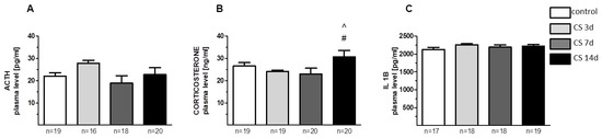 The concentration of adrenocorticotropic hormone (ACTH) (A), plasma corticosterone (CORT) (B), and interleukin 1 beta (IL1B) (C) in plasma isolated from trunk blood of rats that underwent crowding stress (CS) for 3, 7, or 14 days. Bars represent ACTH, CORT, and IL1B concentrations 1 h after the transfer of rats into separate cages and refer to the levels assessed between 1:00 am and 2:00 pm. # p < 0.05 vs. CS 3d (LSD test); ^ p < 0.05 vs. CS 7d (LSD test). n = 16–20/group, as indicated in the graphs.