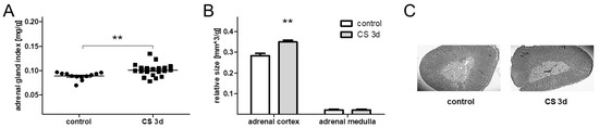 Three-day crowding stress affected adrenal gland morphometry. (A) stress effect on the adrenal gland index measured as the ratio of adrenal mass to body weight (n = 10); (B) stress-evoked increase of the adrenal cortex volume (control: n = 3; CS 3d: n = 4); (C) representative sections of the adrenal gland from control and stressed rats stained with hematoxylin and eosin. ** p < 0.01 (unpaired t-test).