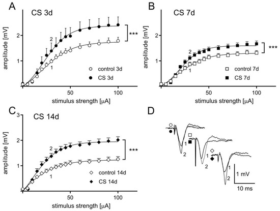 The influence of crowding stress on basal synaptic transmission in the frontal cortex (FC) of rats. The relationship between the stimulus strength and the field potential (FP) amplitude recorded in FC slices from (A) control (n = 11) and CS 3d (n = 8), (B) control (n = 19) and CS 7d (n = 19), (C) control (n = 19) and CS 14d (n = 18). FP traces in (D) show a superposition of averaged FPs recorded in representative experiments at the points indicated by numbers. Symbols (circles, squares, and diamonds) correspond to appropriate plots (A–C). Data are presented as means ± SEM and fitted with Boltzmann functions, whereas statistical comparisons are made for the maximum parameter taken from the Boltzmann fit. *** p < 0.0001 vs. control (post-hoc Sidak’s test).
