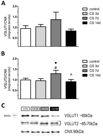 Although a one-way ANOVA analysis did not show significant effects for the expression levels of VGLUT1 [F(3, 20) = 1.3; p > 0.1] and VGLUT2 [F(3, 20) = 2.1; p > 0.1], we noted an increased expression of both VGLUT1 and VGLUT2 (by 30%) in CS 7d vs. control. A post-hoc comparison, which was performed alone, showed that VGLUT2 expression in the CS 7d group was also higher vs. the CS-3d and CS-14d groups (Figure 8).