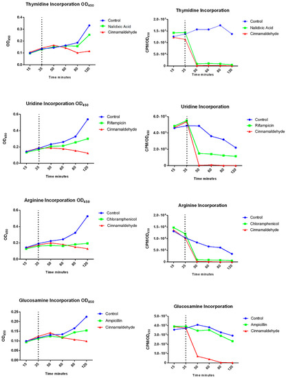 The effects of cinnamaldehyde on the assembly of key bacterial cellular processes was evaluated by testing cinnamaldehyde’s effect on macromolecular synthesis: incorporation of radioactive precursors [methyl-3H] thymidine, uridine, arginine and glucosamine for synthesis of DNA, RNA, protein, and cell wall, respectively (Table 2).