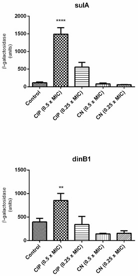 Furthermore, about 30 genes linked to E. coli SOS response are induced after damage to bacterial DNA, among which, sulA is one of the most important [40]. The expression of sulA is an indication of stress, since it increases after DNA damage, and may serve as a basis for studies aimed at evaluating the mode of action of antimicrobial candidates. Moreover, the sulA product acts to prevent cell division when it is not in favorable conditions [41].