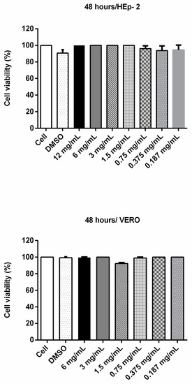 Cell viability assay (MTT) with Vero and HEp-2 cells incubated with cinnamaldehyde at different concentrations for 48 h. To evaluate a possible cytotoxic effect of cinnamaldehyde, the compound at various concentrations was incubated with VERO or Hep-2 cells for 48 h. Then 100 µL MTT (3- (4,5-dimethylthiazol-2-yl) -2,5-diphenyltetrazolium bromide) was added to each well and the plates were incubated for 3 h (37 °C and 5% CO2); after, 2 µL of dimethyl sulfoxide (DMSO) was added. The contents of each well were subjected to absorbance determination at a wavelength of 550 nm.