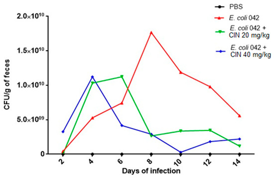 Swiss mice were infected with EAEC 042 and after establishment of colonization, groups of animals were treated daily by gavage with the compound at two different concentrations in order to verify the action of cinnamaldehyde. At the end of the 15 days of colonization, both groups treated daily with cinnamaldehyde (20 and 40 mg/kg) were able to reduce colonization drastically as early as the sixth and eighth day, respectively, leading to the number of CFUs close to zero on the last day, in this way, showing a better performance against the strain of E. coli tested.