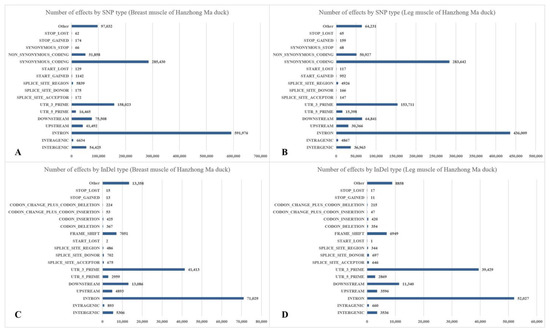Annotation and classification of SNPs and InDels in Hanzhong Ma ducks. (A) SNPs of breast muscle; (B) SNPs of leg muscle; (C) InDels of breast muscle; (D) InDels of leg muscle.